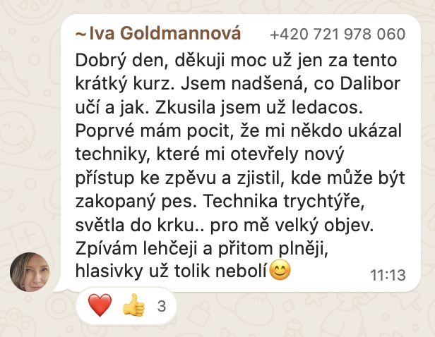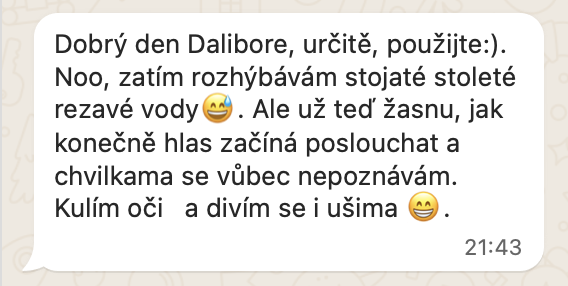 Kurz byl moc fajn, učení jinak. Daleko příjemnější než hlasová cvičení, co znám. Dal mi poznání, že v podstatě asi neexistuje slabý hlas – že se s tím vždycky asi dá něco dělat. A Dalibor jako lektor? Je milý, vtipný, umí zaujmout a baví mě, jak pracuje s vlastním hlasem. Nádherná názorná „pomůcka“, ukázka, co všechno může udělat „jen“ pomocí hlasu a výrazu.